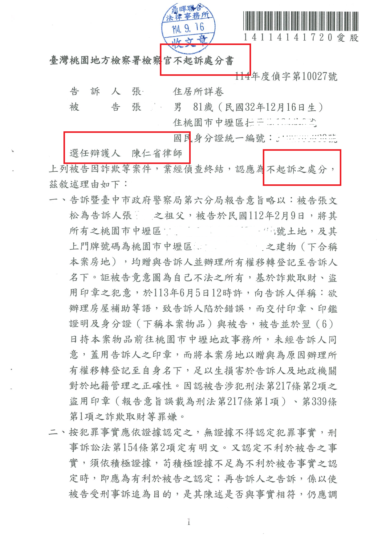 張先生因為將贈於孫女的房地,移轉登記回到自己名下,遭孫女提告盜用印文及提告詐欺,經陳仁省律師辯護下,獲得不起訴處分。