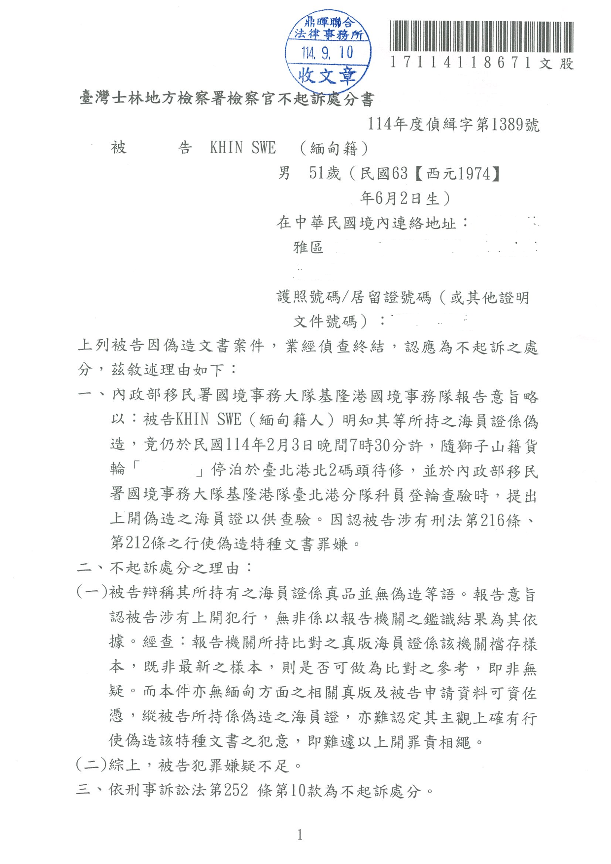 緬甸籍船員KHIM SWE因涉嫌偽造船員證,涉嫌偽造特種文書,經陳仁省律師撰寫答辯狀辯護,獲得不起處分。